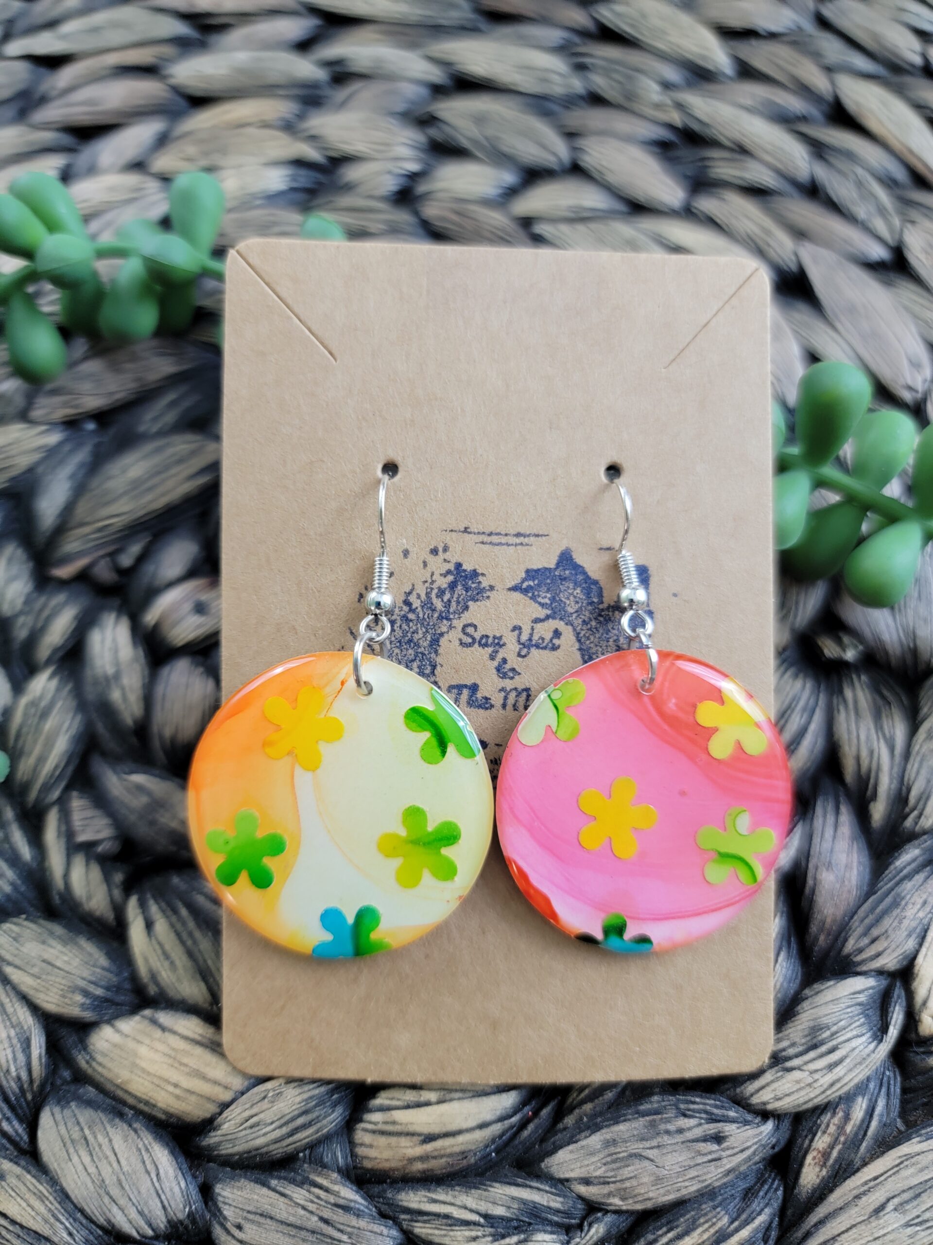 One-of-a-kind alcohol ink earrings featuring 70’s vibe multi-color flowers on orange & pink backgrounds, finished with high quality resin on both sides.