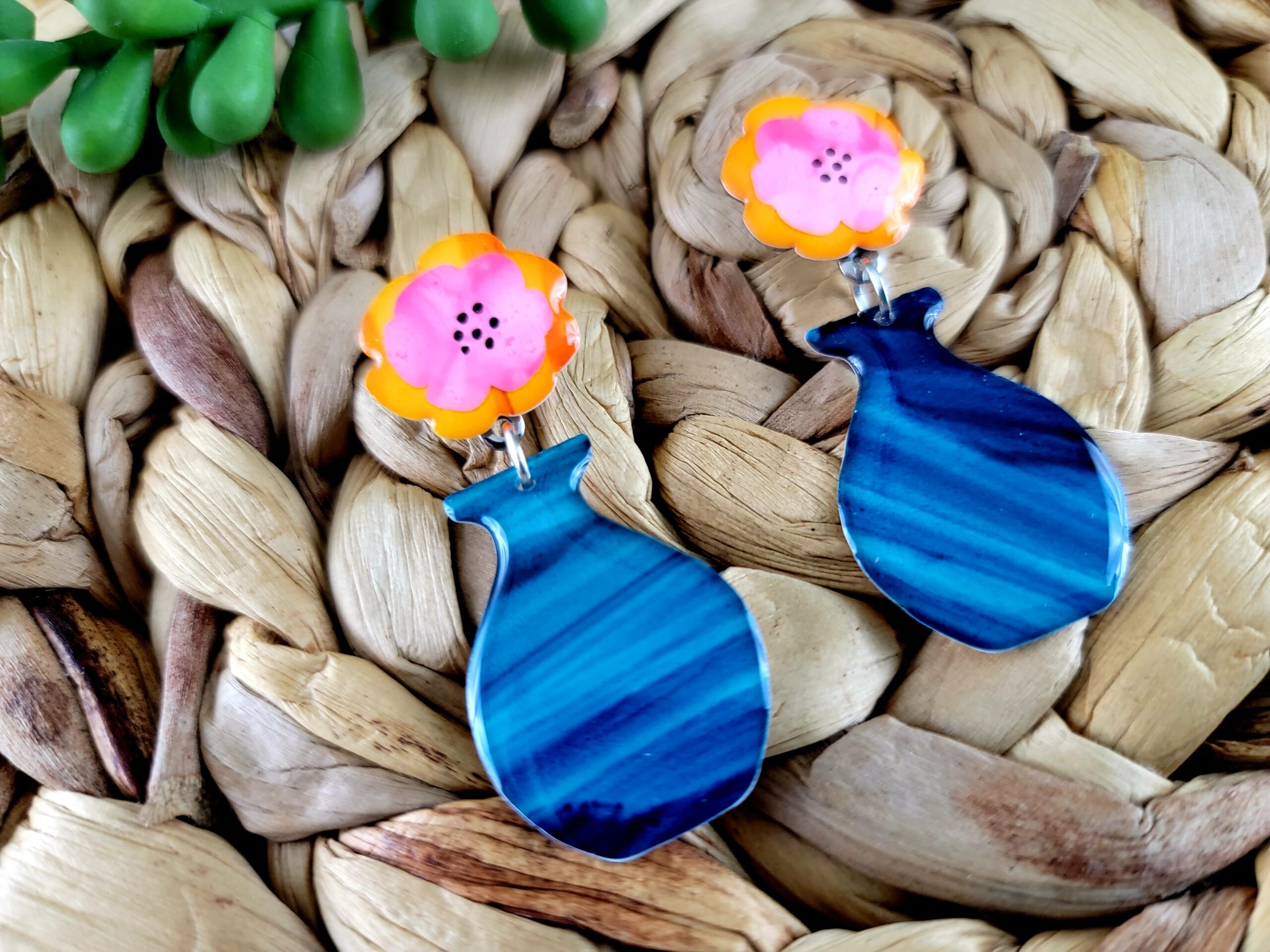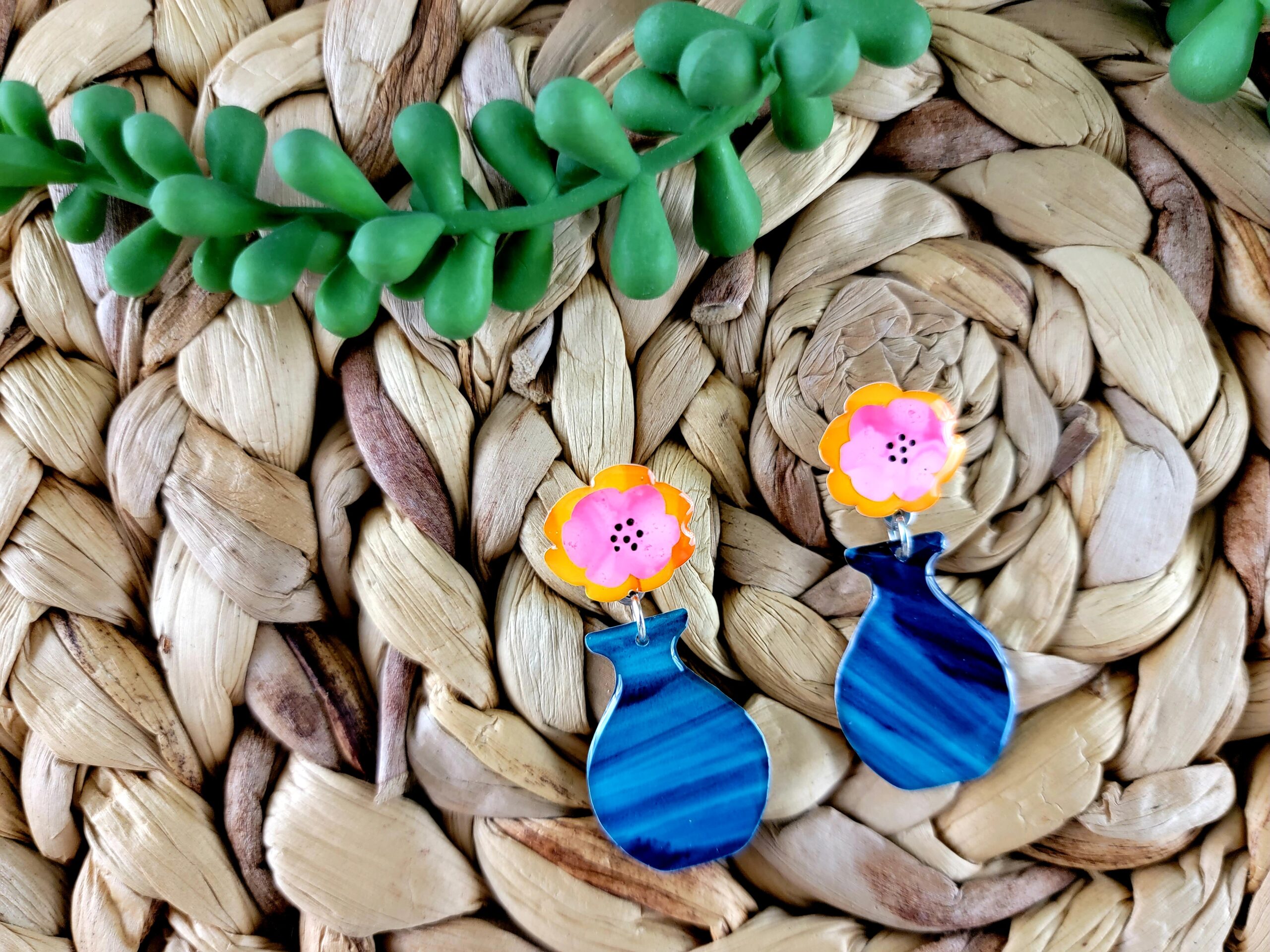 One-of-a-kind hand-painted earrings featuring flower and vase, and finished with high quality resin on both sides.