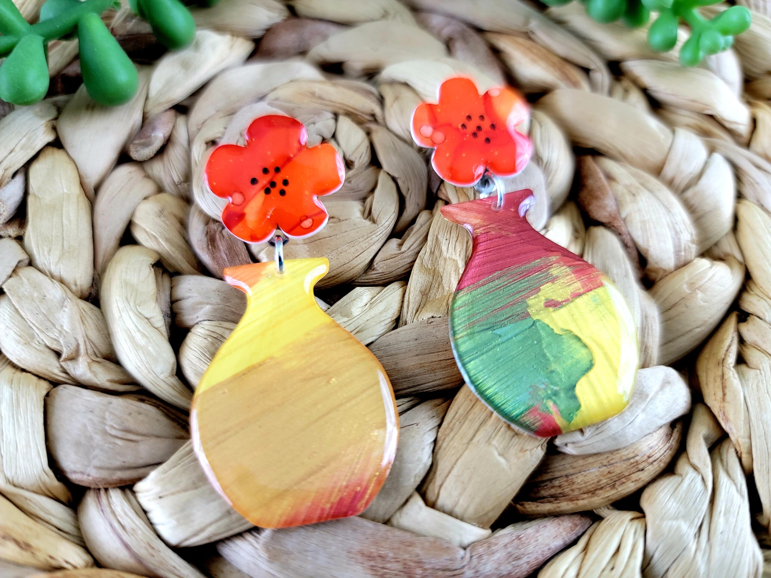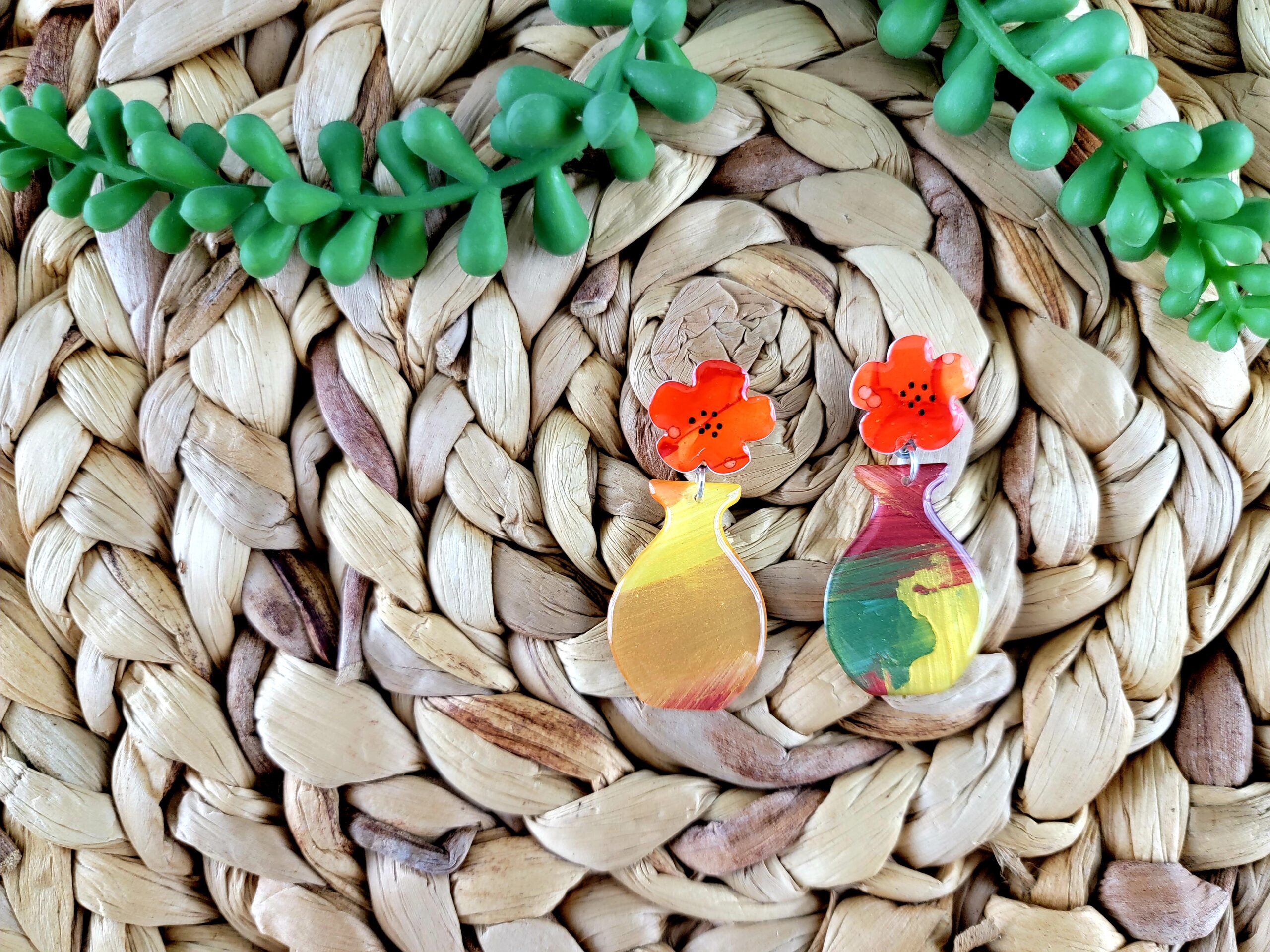 One-of-a-kind hand-painted earrings featuring flower and vase, and finished with high quality resin on both sides.