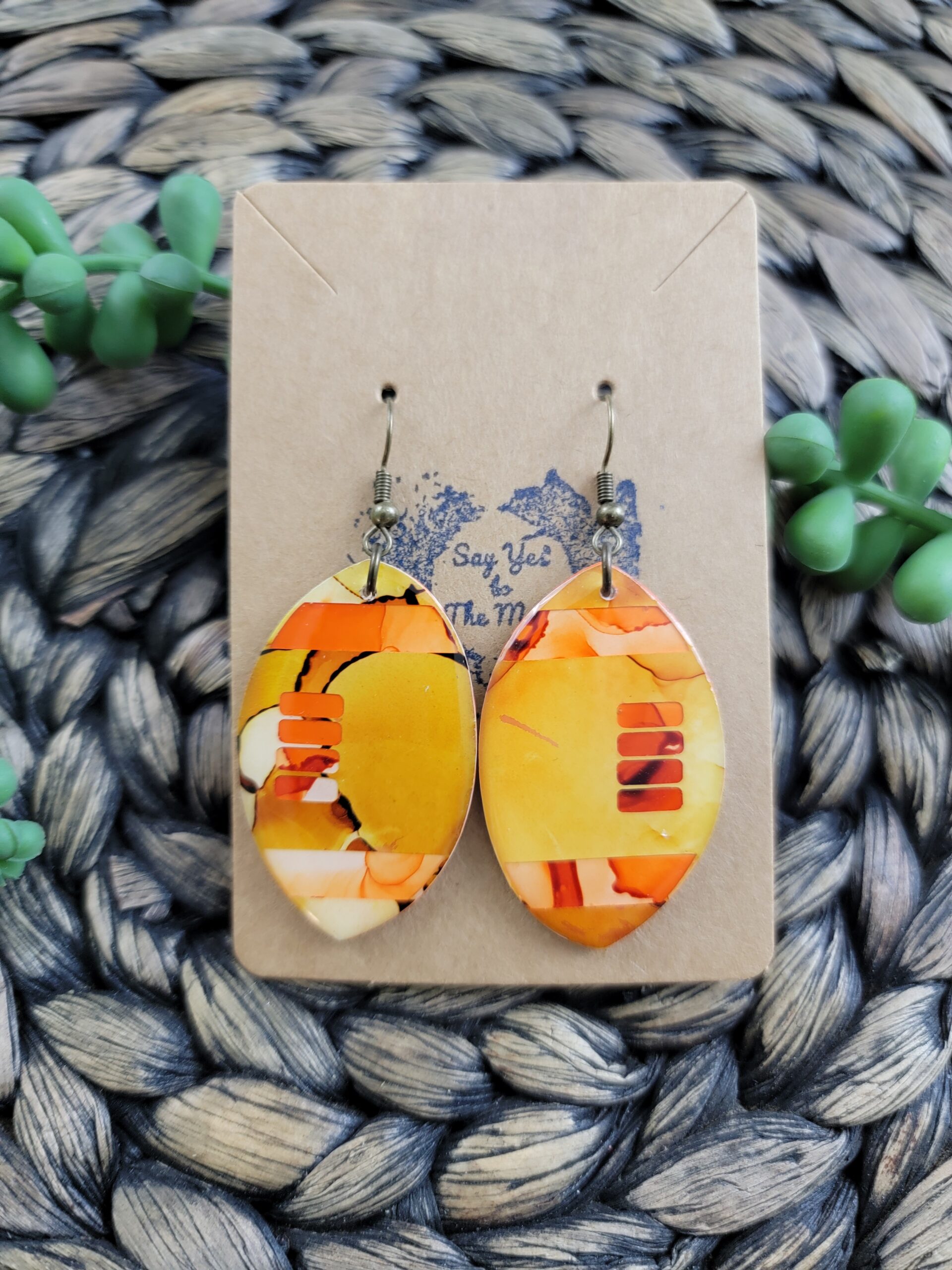 One-of-a-kind alcohol ink earrings featuring light brown footballs over an orange background, finished with high quality resin on both sides.