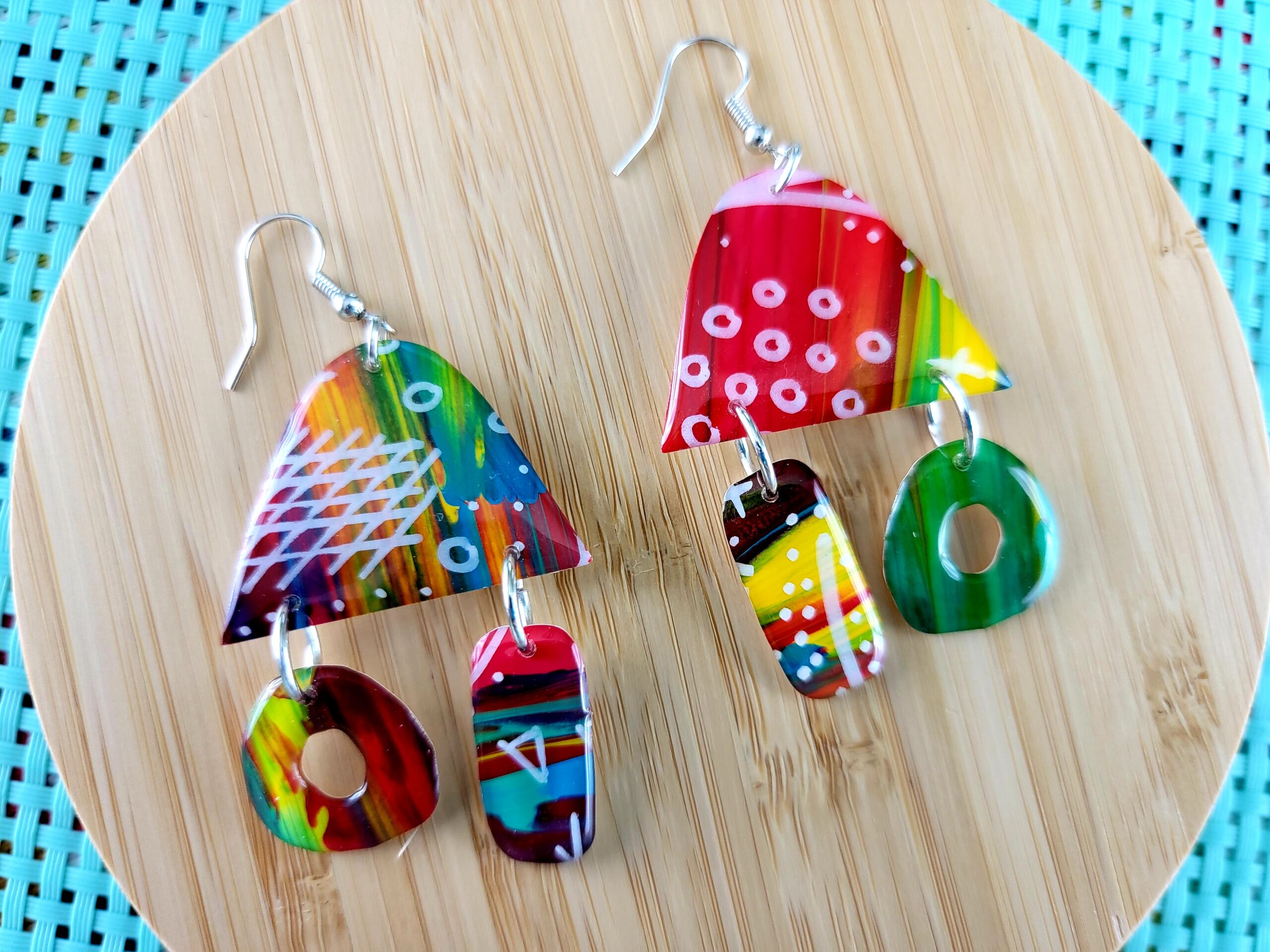 One-of-a-kind hand-painted earrings featuring a hyperbolic shape with round and rectangular drops, and finished with high quality resin on both sides.