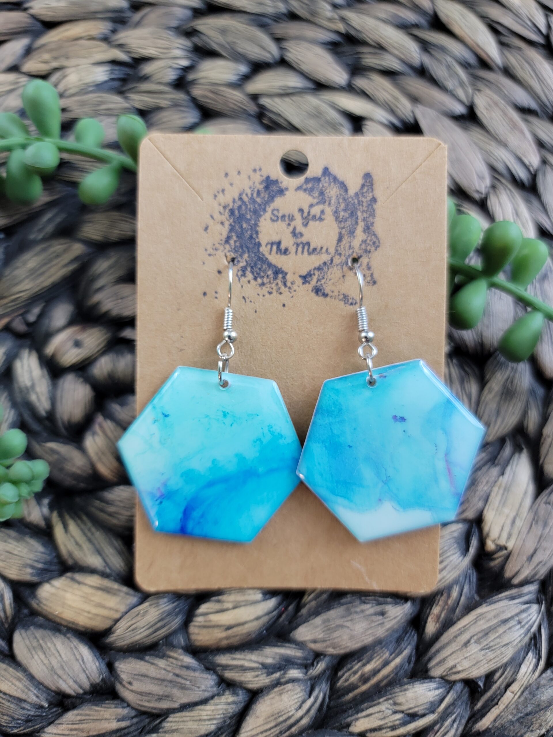 One-of-a-kind alcohol ink earrings featuring light and dark blue, finished with high quality resin on both sides.