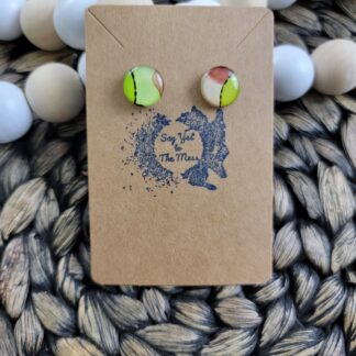 One-of-a-kind alcohol ink earrings featuring maroon and green, finished with high quality resin on both sides.