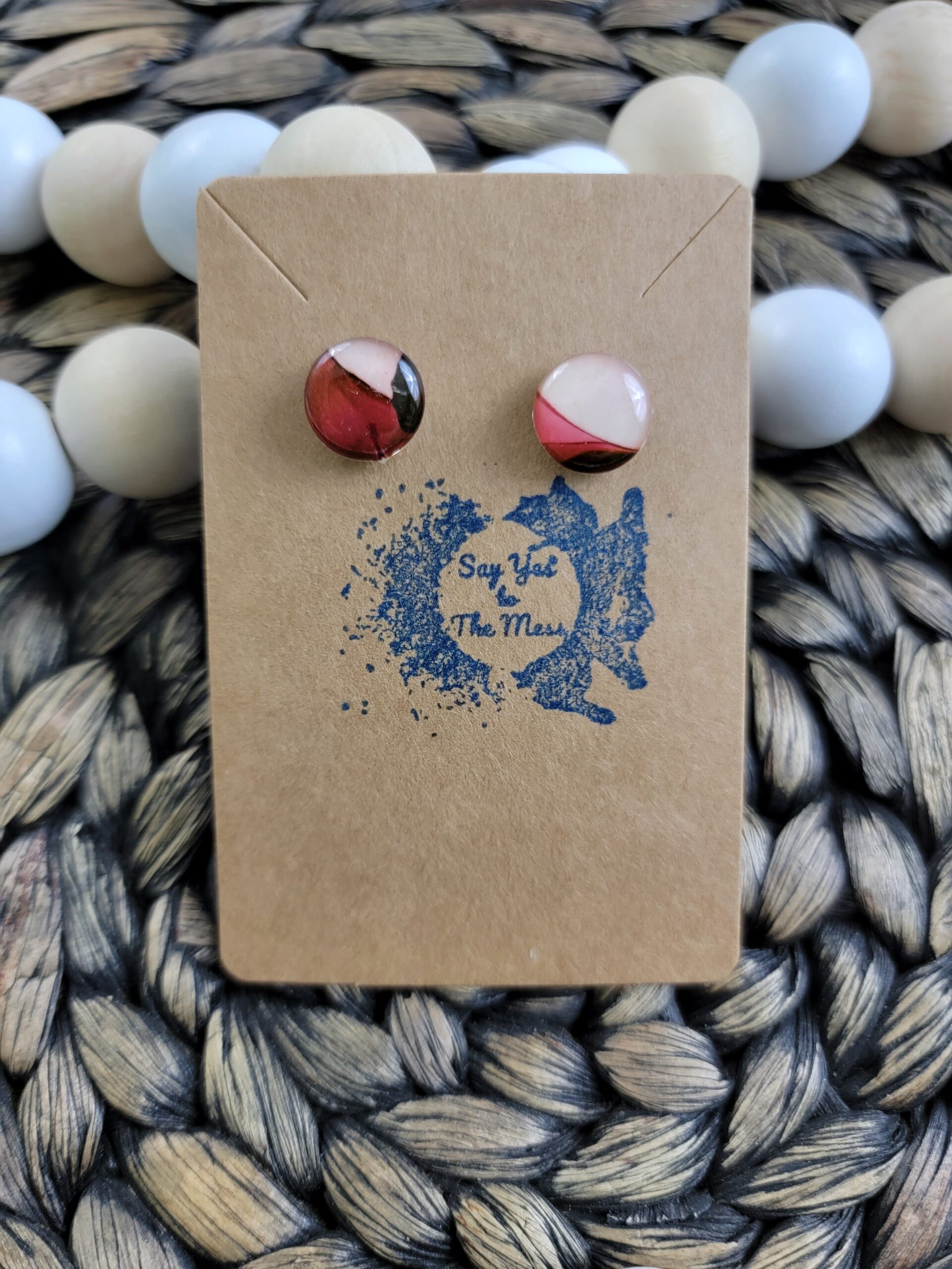 One-of-a-kind alcohol ink earrings featuring maroon and pink, finished with high quality resin on both sides.