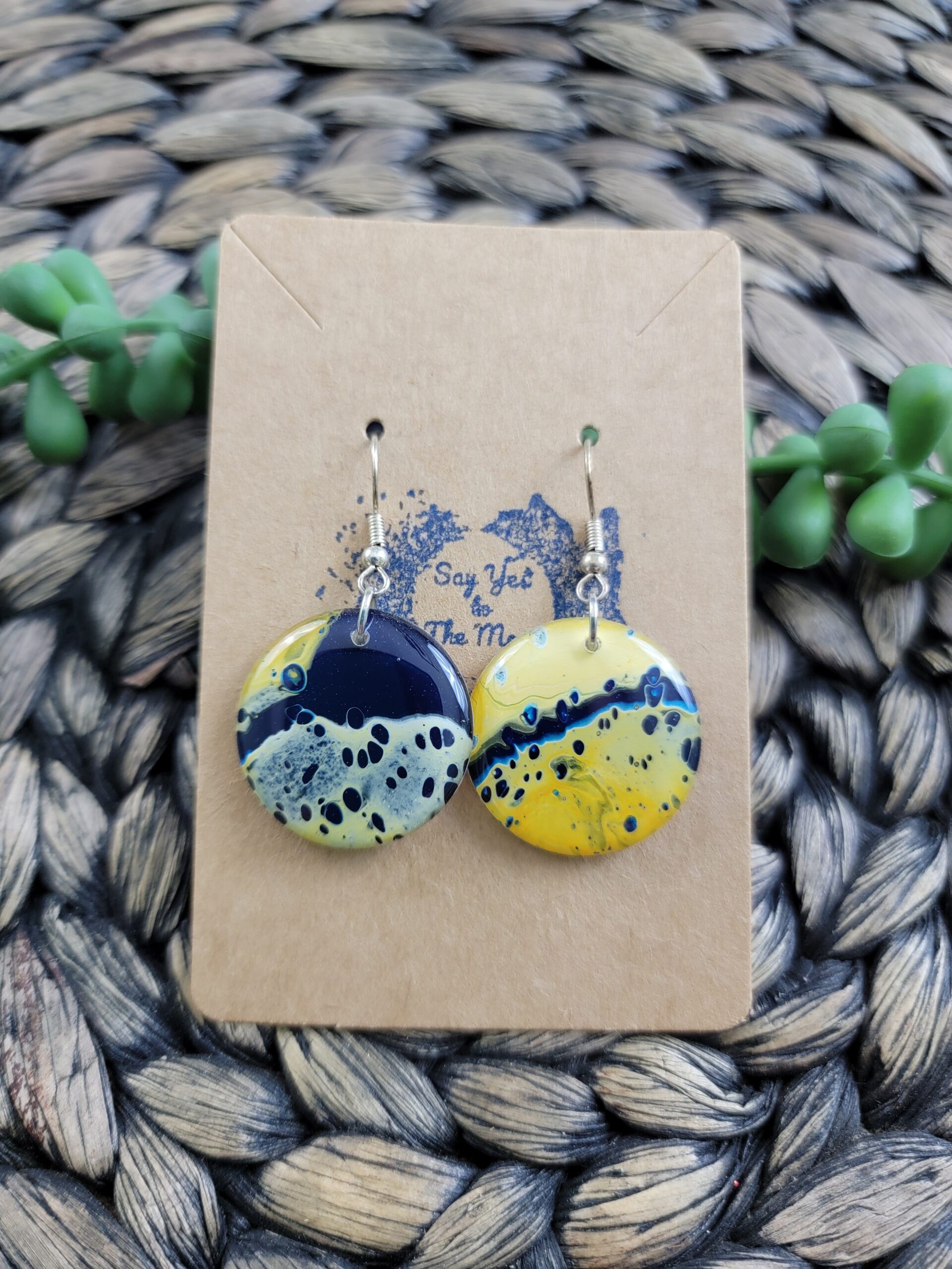 One-of-a-kind acrylic pour earrings featuring navy and yellow, finished with high quality resin on both sides.