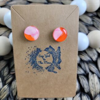 One-of-a-kind alcohol ink earrings featuring pink and orange, finished with high quality resin on both sides.