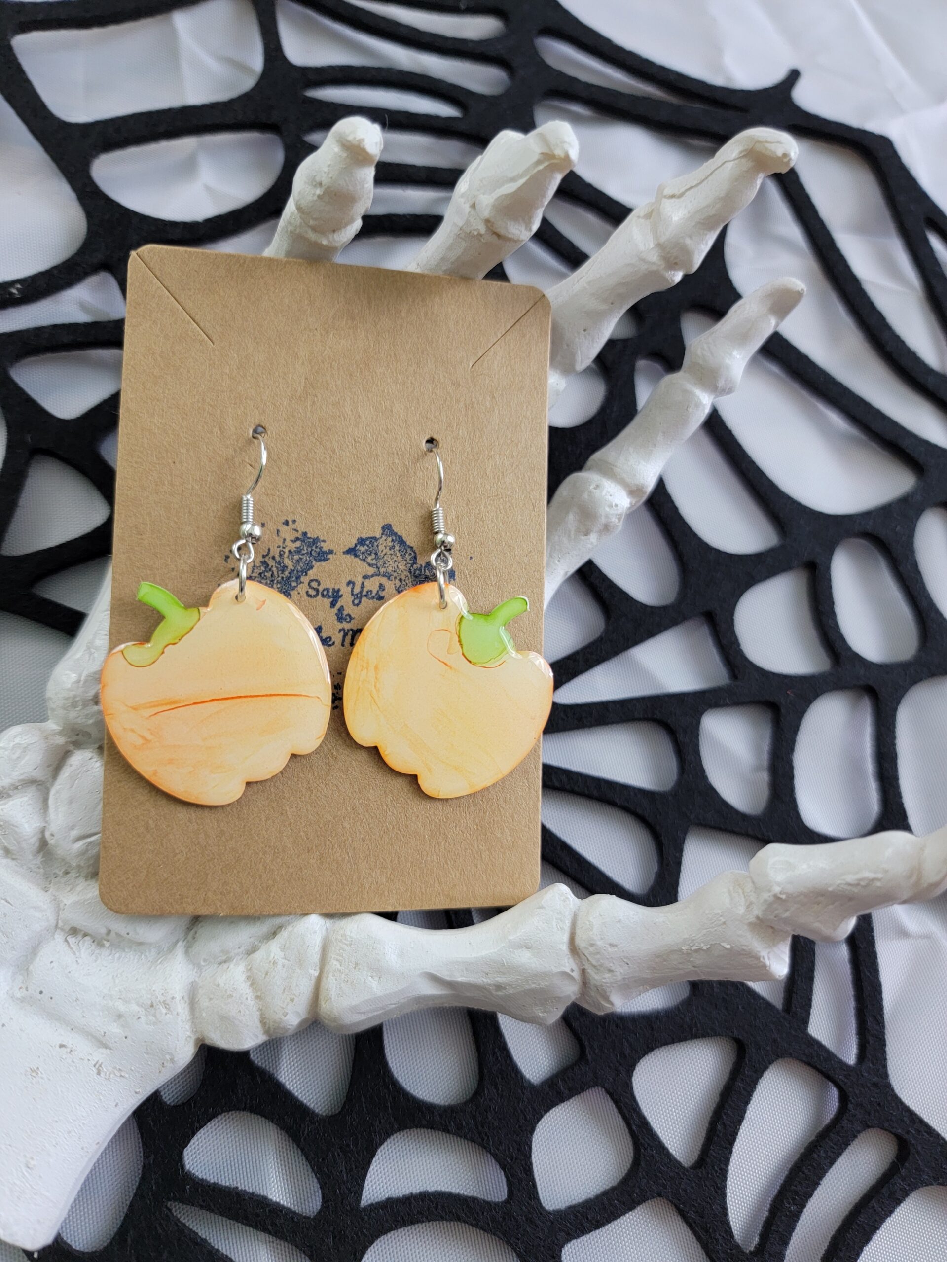One-of-a-kind alcohol ink earrings featuring orange and green, finished with high quality resin on both sides.