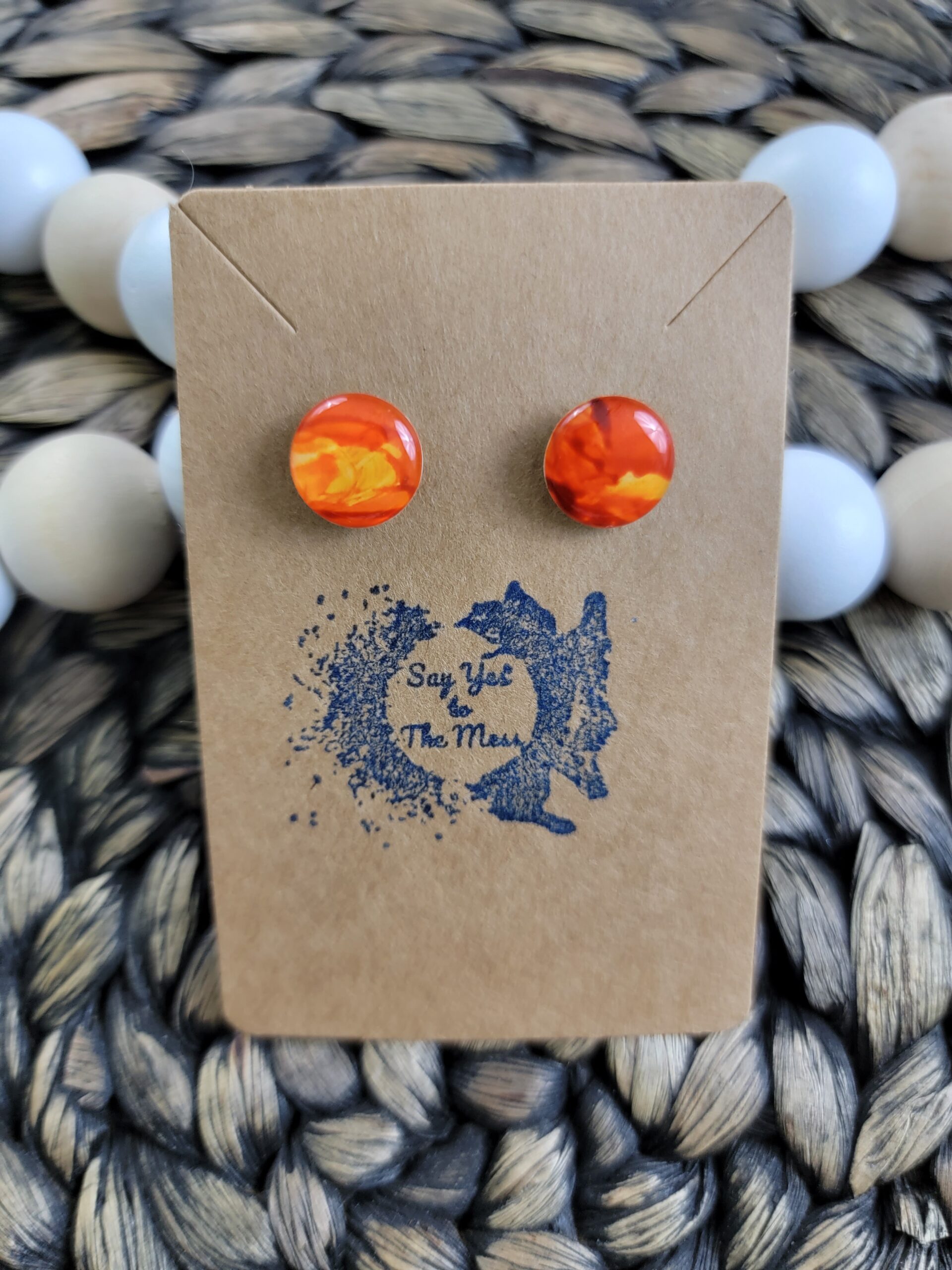 One-of-a-kind alcohol ink earrings featuring red, orange and yellow, finished with high quality resin on both sides.