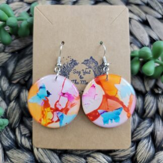 One-of-a-kind alcohol ink earrings featuring an orange & pink base with blue and pink butterflies, finished with high quality resin on both sides.